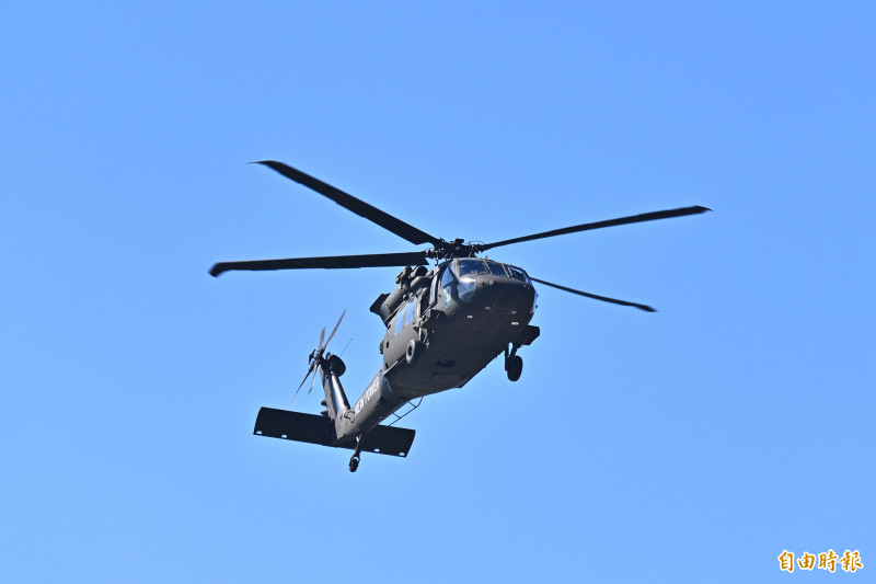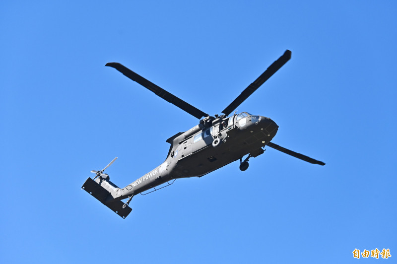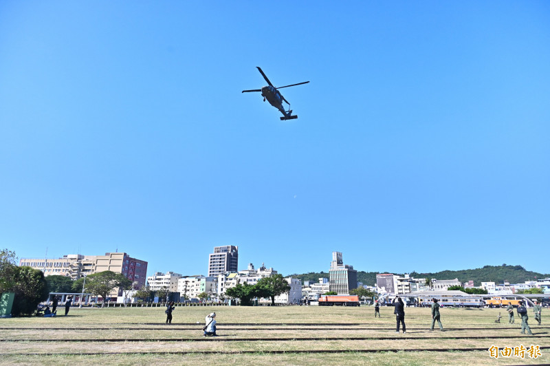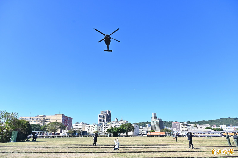 UH-60M 黑鷹直升機在駁二上空滯空懸停演練。(記者李惠洲攝)