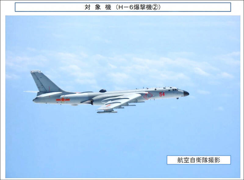 國防部表示,自上午9時5分起,陸續偵獲中共殲-10、轟6K、空警-500等各型主、輔戰機及無人機計27架次出海。圖為轟6轟炸機。(資料照,取自日本防衛省統合幕僚監部網站)