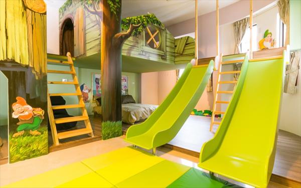 最令小朋友瘋狂的是每房都有溜滑梯,「迪利小屋」親子民宿連大人看了也好想去喔!其中,白雪公主房甚至還有全台獨創的雙軌溜滑梯,不僅夠刺激好玩,「迪利小屋」也注意孩子們的安全,溜滑梯下方都有防撞護墊,並且在客人退房後徹底的消毒與清潔,為孩子們打造一個安全、安心的溜滑梯樂園。