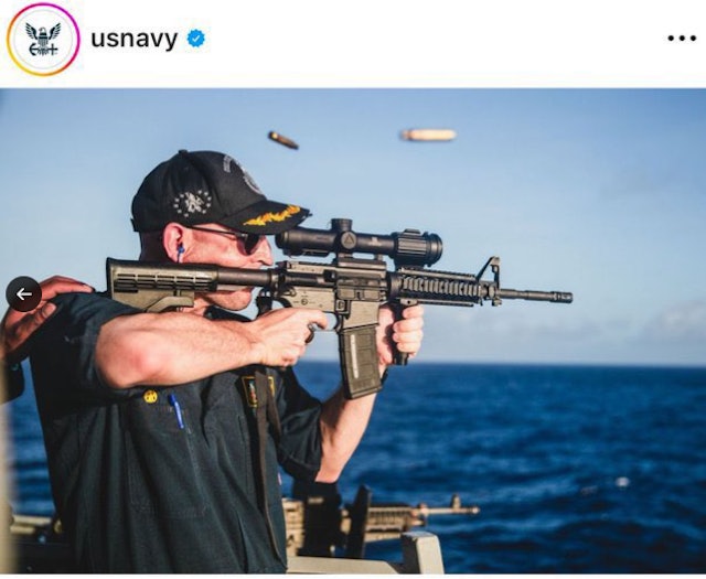 圖為2024年4月美國海軍在社交平台發布的相片,亞斯特在相中持槍,卻被網民質疑瞄準鏡安裝錯誤。(截圖自X@Greg86527593)