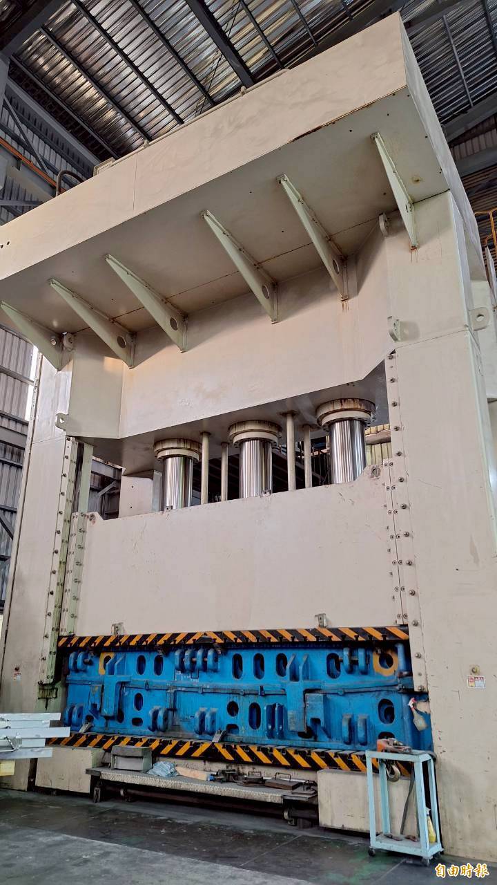 圖為2000噸級的金屬沖壓機,透過模具將鋁合金壓塑成形。(記者吳哲宇攝)