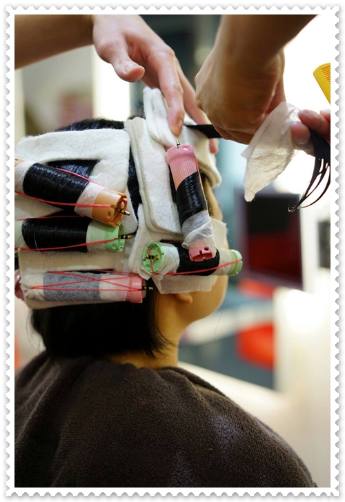 清楚的看到有不同顏色不同大小的捲子,為的就是依照我頭髮的狀況而用不同的捲子。捲的方向不同所呈現的效果也不同,像耳側有兩捲是較能表現捲度,能在正面看時呈現自然又明顯的捲度。在前面上側的捲法會往後方捲,讓我的頭髮呈現自然向後方的波度感,不致放往前垂吊蓋臉,一直撥頭髮的冏況。