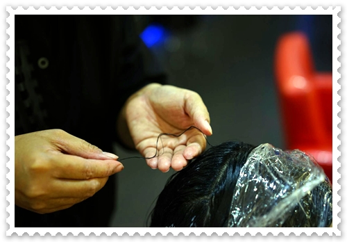 剪好髮型後,便開始軟化頭髮的步驟