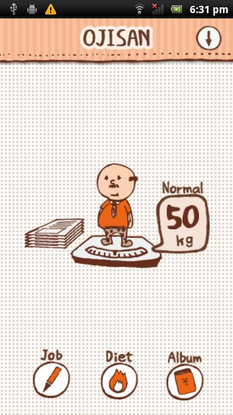 點擊“Job”你可以關閉列表裏不用的APP。“Diet”裏是手機程式列表,軟體的大小用卡路裏來表示,軟體右邊的按鈕代表卸載,別按錯了喲。“Album”是大叔的相冊,這個軟體還有個養成模式,清理、卸載應用列表,都是幫助大叔成長手段。