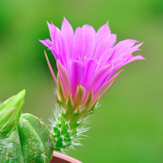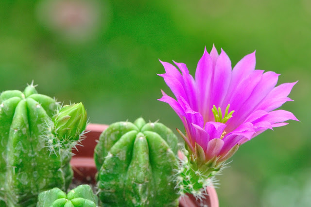 簡介:仙人掌科蝦仙人掌屬(鹿角柱屬)多年生草本,原產墨西哥,是美桃蝦的無刺或少刺亞種。莖圓柱狀,有5~7稜,稜上無刺或有白色或淺黃色的短刺,長約0.2cm。莖容易從基部分生,外表綠色,質地較柔軟,長可達50cm,直徑約5~7cm,長伸的莖容易四散歪斜,缺水時莖容易縐縮,低溫期可能休眠。萼筒有白色的刺,花瓣桃紅色,基部深紅色,蕊柱綠色或淺綠色,花徑6~10cm。開花期4~5月。