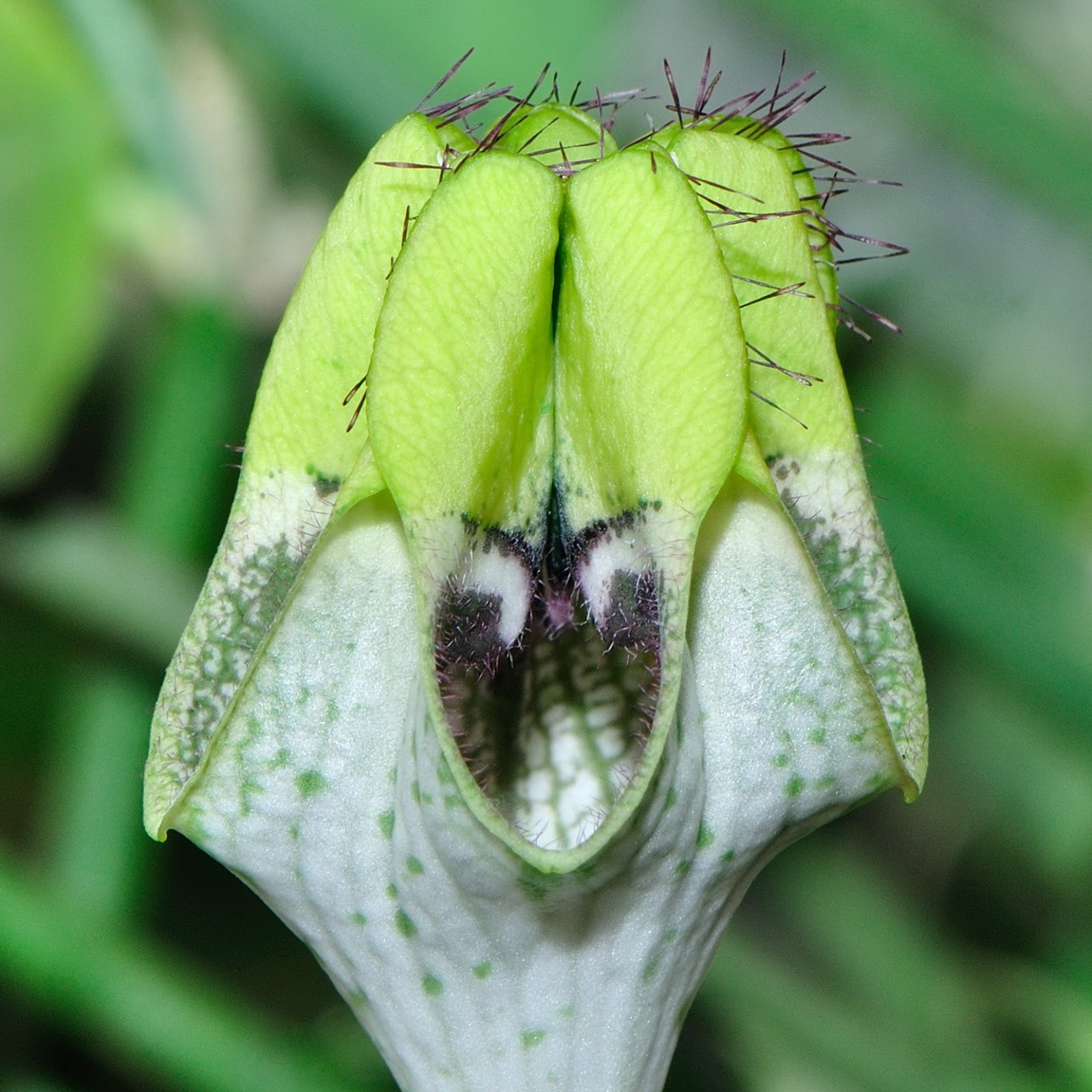 簡介:蘿藦科蠟泉花屬的多年生蔓性草本,是福光綠(福光緑、福先緑)Ceropegia radicans與醉龍(酔竜)Ceropegia sandersonii的天然雜交種。肉質莖匍匐或下垂生長,莖直徑0.3~0.5cm。厚革質對生葉片心型,葉長約1.5cm、葉寬約1cm,葉面綠色、葉背淺綠色,葉緣波浪狀。喇叭狀花自葉腋伸出,花直立或斜伸,花長5~7cm,花徑2~2.5cm,綠色花冠鑷合,花冠裂片邊緣有白色或紫色流蘇狀毛,花中段略彎曲。花裂片具紫褐色斑點與脈紋,背面白色有綠色斑點。開花期不定。