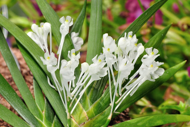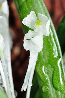 簡介:蘭科足管蘭屬的多年生草本,廣佈西非至中非的中高海拔山區,以氣生根附著於樹枝上生長,是單莖性著生蘭。莖短縮,互生葉片呈扁平扇形排列,鐮刀形葉片長5~8cm、寬幅0.5cm,每株葉片4~10枚。近繖房花序自植株基部伸出,花序柄長約5cm,通常較葉片短,一株可長出1~3枝花序。白色花半透明,花瓣向內彎曲略呈抱合狀,藥帽綠色。脣瓣圓形漏斗狀有長距,距末端魚尾狀分叉突起。花含距長1.3~1.5cm、花徑0.3~0.5cm。開花期夏至秋季。