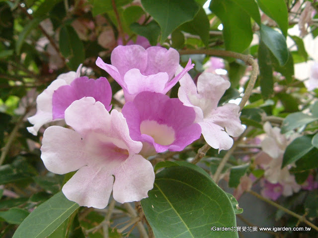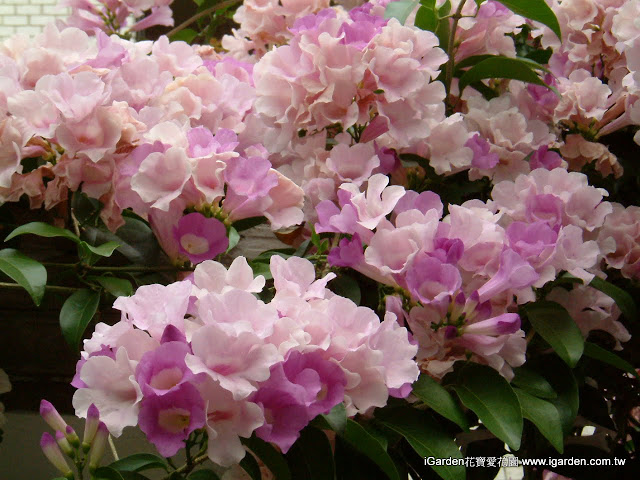 蒜香藤又名張氏紫葳、紫鈴藤,屬於紫葳科多年生藤本植物,原產於熱帶美洲。植株蔓性,具卷鬚,葉子為二出複葉,深綠色橢圓形,具光澤。花腋生,聚繖花序,花冠筒狀,開口五裂。花剛開時為粉紫色,再慢慢轉成粉紅色,再變白色後掉落,花期為春至秋季,但春、秋2季是盛花期。由於花朵及葉片搓揉後,會有大蒜的氣味,因此被命名為蒜香藤。