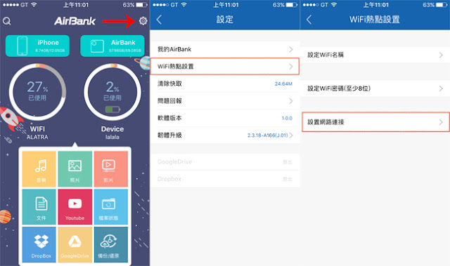 首先稍微解惑一下,相信有些朋友在看產品介紹的時候,會有一個小小的疑問... AirBank M100的連線方式,是透過WiFi無線連接,那麼連線後是不是就等於沒有(免費的)無線網路連線了? 我只能用自己的4G行動網路流量嗎?不用擔心! 其實AirBank M100同時也是個小小路由器, 在APP中就可以設定M100連線到WiFi區網喔!