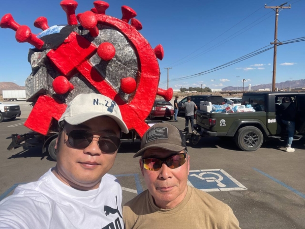 對於這次遊行車隊的規模,邢鑒目測,出發的時候有20多輛車,有一輛車拖著中共病毒的雕塑。車上掛著旗,掛著「COVID19 Made in CCP」(新冠病毒中共製造)、「CCP get out of America」(中共滾出美國)等標語。車隊還帶了兩輛房車,休息時一部分人睡在房車裡面,有部分人就睡在自己車裡面,還有露營的。