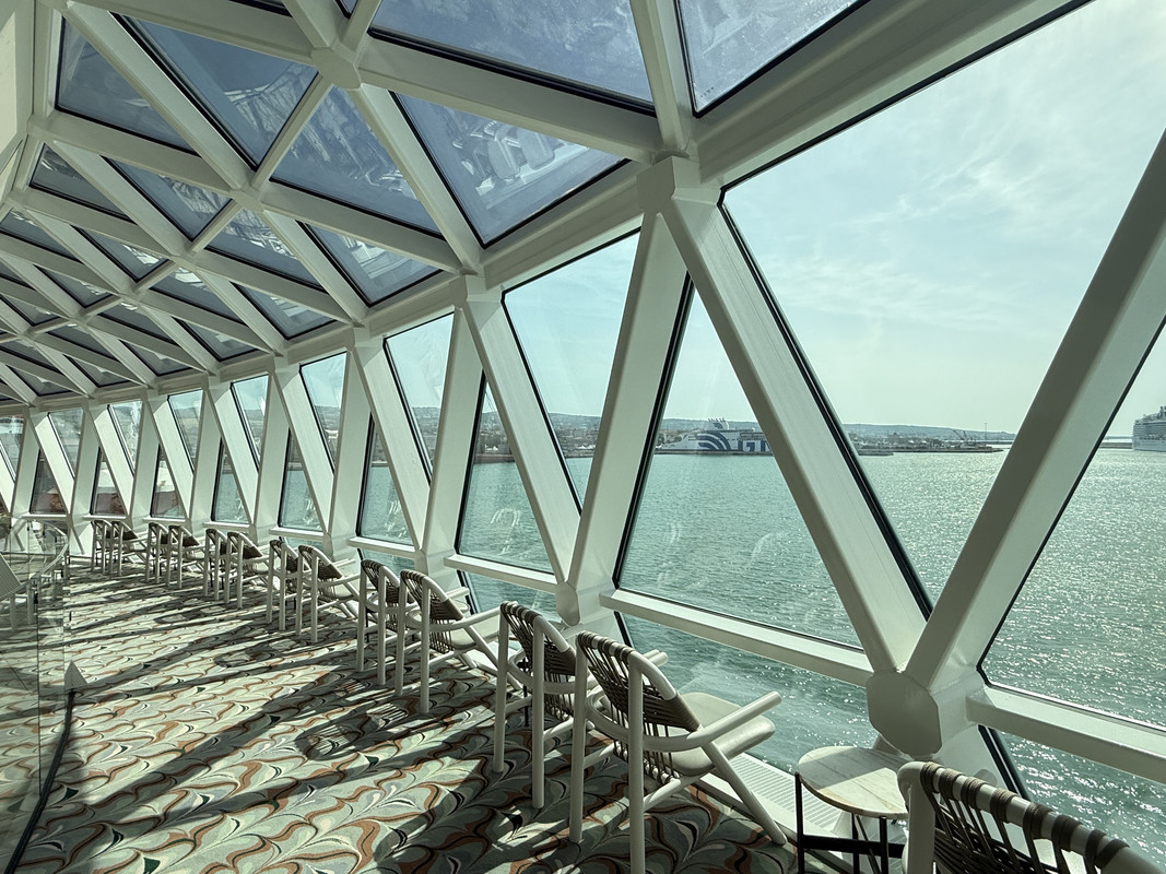 船上優雅奢華的象徵,則是鑲嵌超過6萬顆施華洛世奇水晶的旋梯,讓旅客每一步都踏在閃耀光芒中,可說是船上最夢幻的伸展台。而面朝大海、全透明設計的景觀電梯,亦是獨特的隱藏版打卡景點。