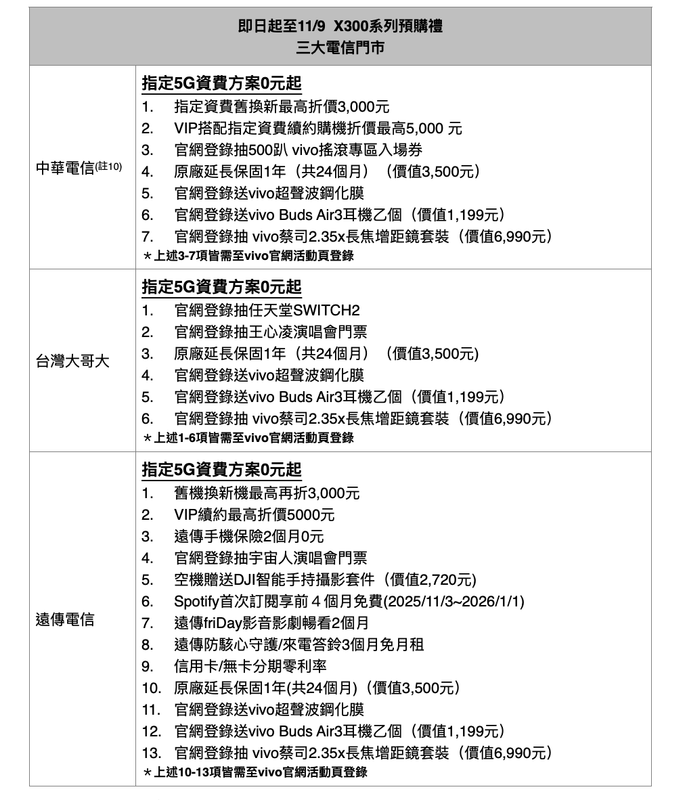 此外,凡於指定通路預購X300系列並完成官網登錄,可參加抽獎,獎項包括巨星演唱會門票(每1組2張) 、世界五大洲奢旅雙人遊,以及X300 Pro全能攝影師套裝2盒,共抽出5組幸運得主。