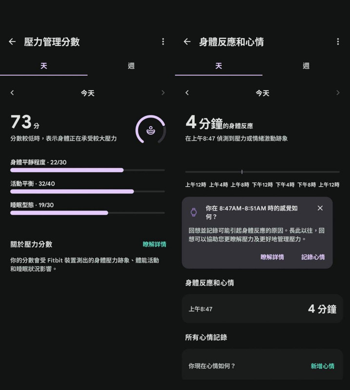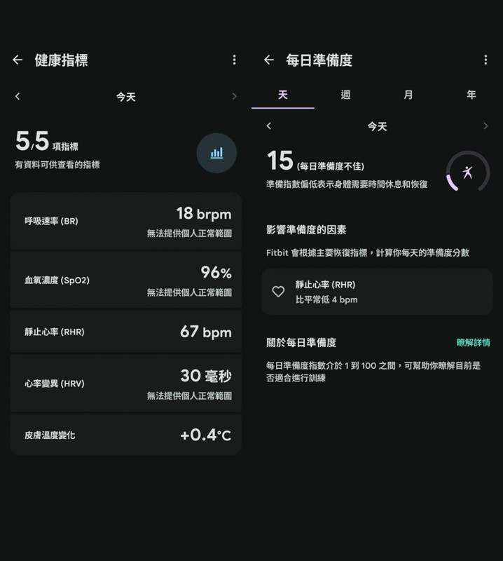 透過 Fitbit App,可以查看健康指標來迅速檢視身體狀況,也能參考每日準備度來確認今天的體能狀態,加以調整訓練計劃,不過部分數據會需要7天以上的連續配戴,才能讓數值比較精準。