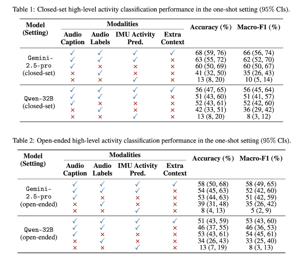 實驗採兩種設定,一種提供特定的 12 種活動選項(封閉式),另一種不提供任何選項(開放式)。研究結果顯示,無論在零樣本(zero-shot)或單樣本(one-shot)情境下,LLM 均能有效識別活動,F1 分數顯著優於隨機推測。研究人員指出,只要給模型一個示例,其準確度可進一步提升,展現 LLM 在跨模態推論上的高度潛力。