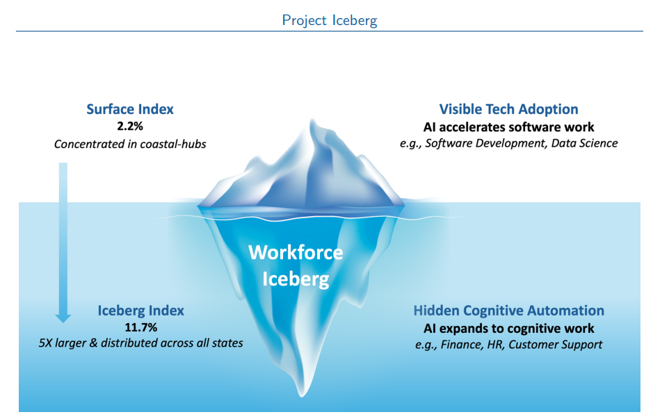 冰山指數揭示的勞動力影響程度比可見的科技採用規模大五倍。水面之上:表面指數(2.2%)追蹤目前沿海科技中心的AI採用情況。水面之下:冰山指數(11.7%)衡量涵蓋全國行政、金融和專業服務業的技術能力。這個隱藏的巨大部分代表,僅基於可見科技部門信號制定的勞動力準備策略可能會有所不足。