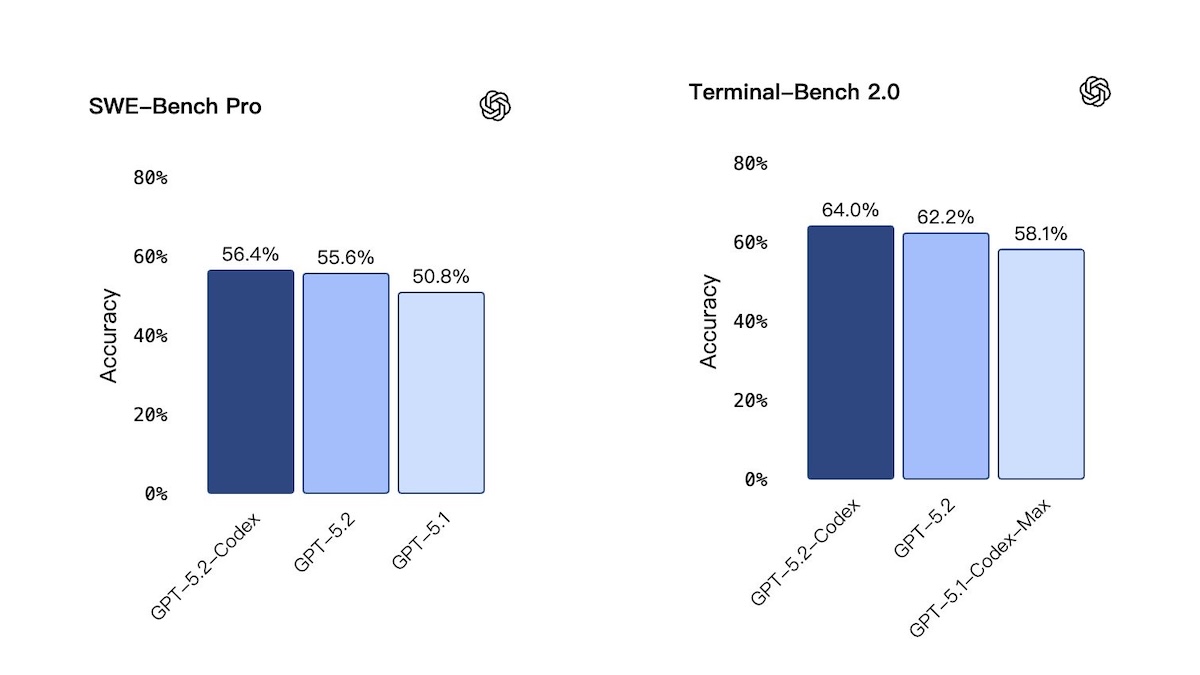 OpenAI 指出,GPT-5.2-Codex 在 SWE-Bench Pro 基準測試取得前所未有的好成績,準確率達到 56.4%,超越其他編碼模型。它在 Terminal-Bench 2.0 基準測試也獲得 64% 的分數,優於過往 Codex 版本。