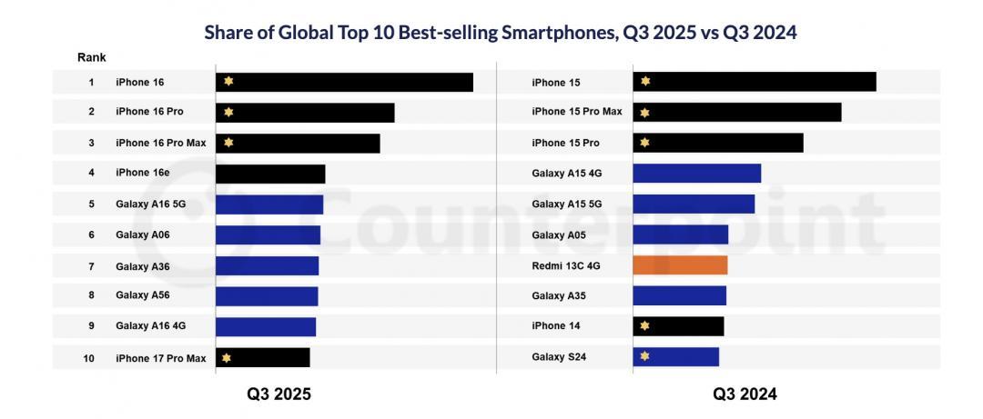 全球2025年第三季TOP 10暢銷手機。