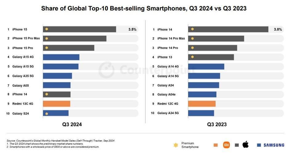 全球2024年第三季TOP 10暢銷手機。