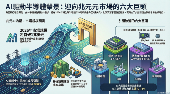 美國銀行 (Bank of America, BAC) 最新發表的最新深度研究顯示,分析師預測,2026 年將成為半導體歷史上的關鍵里程碑,全球半導體年度市場規模預計將成長 30%,並首度突破 1 兆美元的歷史大關。