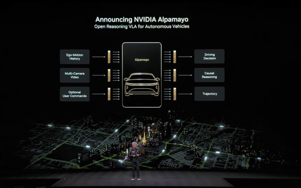 輝達執行長黃仁勳(Jensen Huang)在主題演說上明確指出,雖然特斯拉與 Waymo 擁有強大的自主研發自動駕駛系統,但輝達的目標是為其他所有人提供技術。尤其,Alpamayo 系列模型的核心在於其推理式視覺語言動作模型,這種技術賦予了自動駕駛決策系統類似人類般的思考能力。使得該系統不僅能接收感測器輸入並啟動轉向、煞車與加速,還能針對其即將採取的行動進行邏輯推理。
