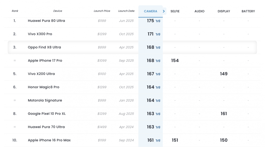 隨著新機上市,DXOMARK更新了最新的全球手機拍照排行榜,去年底上市的vivo X300 Pro空降第2名,贏過蘋果iPhone 17 Pro,僅次於華為Pura 80 Ultra。DXOMARK給vivo X300 Pro的評價指出,在照片與影片拍攝都展現出高水準的細節表現。此外,Motorola Signature也成功擠進第6名。
