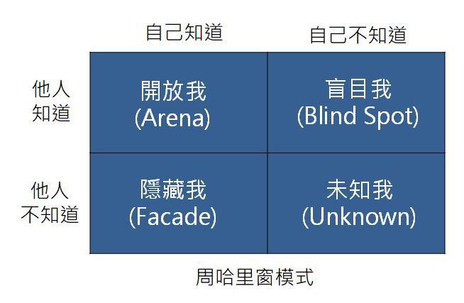 - 未知我:自己和旁人都沒有意識到的潛在自我。